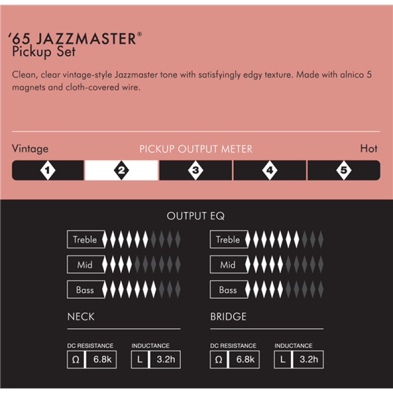 Clean clear vintage style Jazzmaster tone with satisfying edgy texture. No other pickups project the iconoclastic clean-and-clear vintage-style tone, edgy snarl and undeniable texture of the 1965 Fender Jazzmaster like Pure Vintage pickups. Made with Alnico 5 magnets and cloth covered output leads. Fender includes aged white pickup covers, mounting screws and hookup instructions. Both pickups are position marked on the bottom of their grey fiberboard coil forms. The bridge pickup is marked with a small red dot, the neck pickup with a small blue dot.